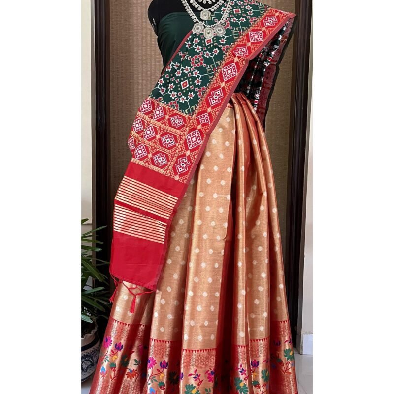 ₹5,500.00Indulge in the regal allure of our redĀ Paithani silk lehenga, a timeless masterpiece that epitomizes grace and elegance. Handcrafted with meticulous precision, each intricately woven motif tells a story of tradition and heritage. Adorned with vibrant hues and exquisite detailing, this lehenga is a testament to opulence and sophistication, perfect for those seeking to make a statement at any occasion NOTE – Since this product is handwoven, there might be slight irregularities. Please note that the color of the product may vary.