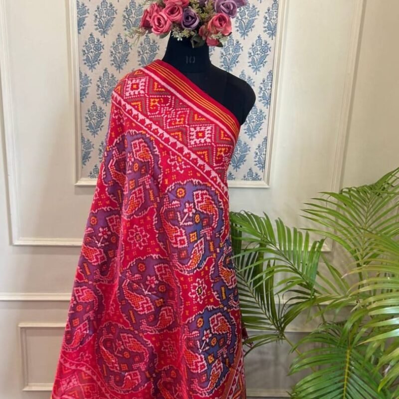 ₹9,500.00A pure handloom semi patan duppatta woven in beautiful colors of green,pink and red in nav ratan motifs using organic dyes making it sustainable handloom.It is prepared using PURE NATURAL SILK and zari. Highlight of Patola handloom is that it can be worn on either side and the design pattern on the original and opposite looks very similar due to the artistic and delicate nature of designs. On the patola, a high amount of labour cost is incurred in the production process. Due to durable material and artistic and costly colours, the lifespan of patola handloom is very high. -